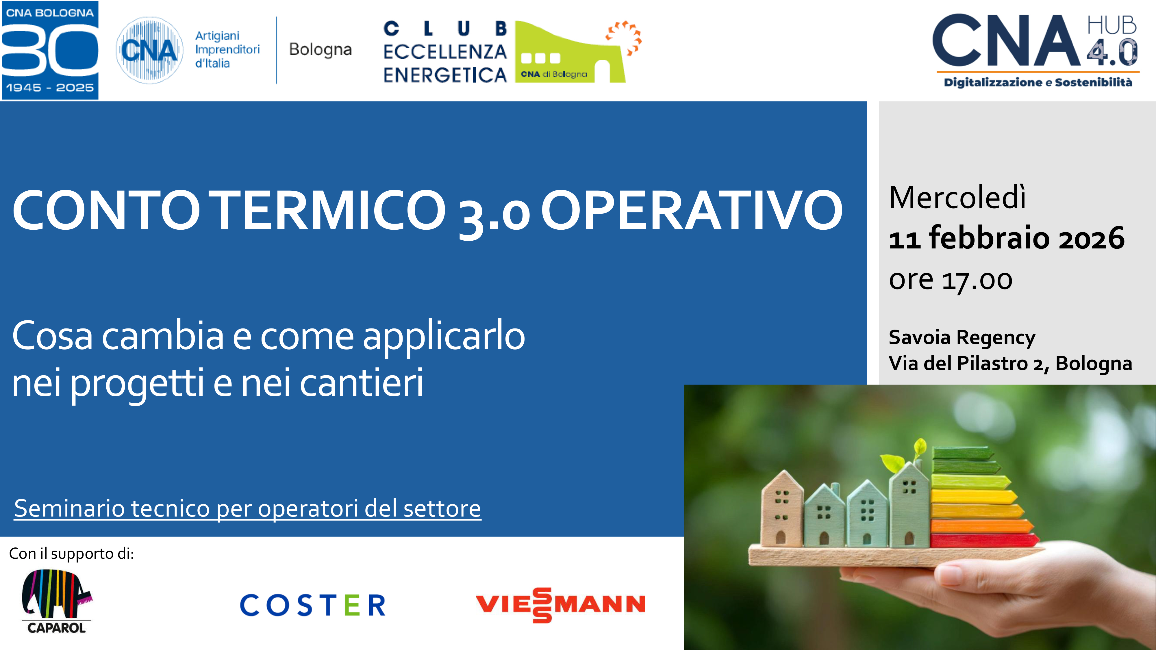 Seminario Conto Termico 3.0 - Bologna 11.02.2026 Question Title * 1. Informazioni di contatto Ragione sociale Partita iva Nome e Cognome Comune email Telefono Question Title * 2. Settore attività PROGETTAZIONE EDILE PROGETTAZIONE IMPIANTISTICA COSTRUZIONI INSTALLAZIONE IMPIANTI TERMICI INSTALLAZIONE IMPIANTI ELETTRICI SERRAMENTI Altro (specificare) Question Title * 3. Socio Cna? Si No Succ.
