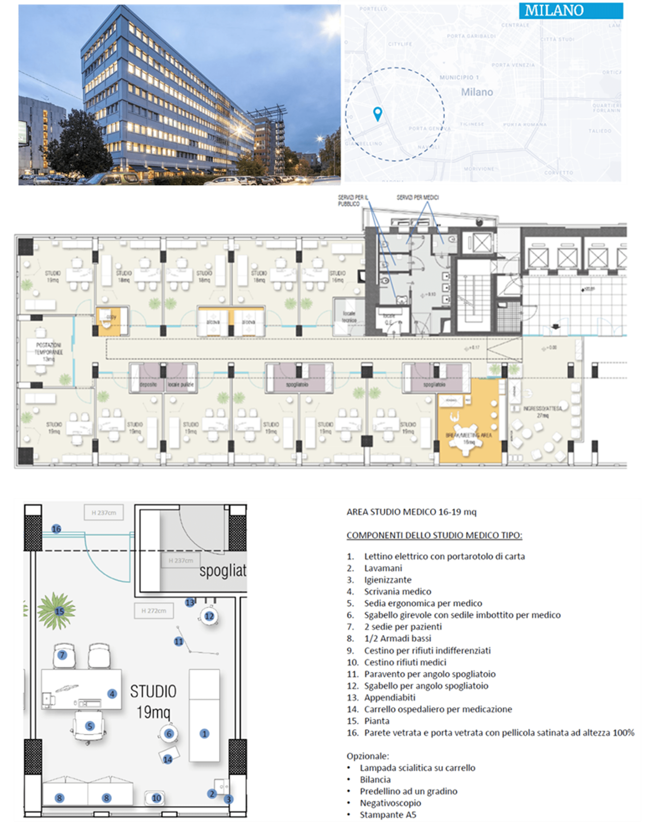Il Progetto, destinato ai medici, sarà realizzato in una parte del sesto piano, creando undici studi medici, una reception, un’area break e una saletta polifunzionale.