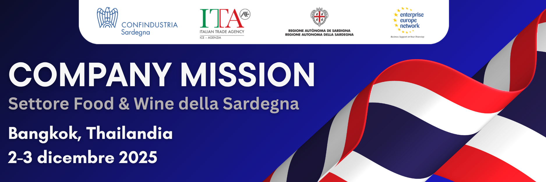 Confindustria Sardegna, nell’ambito delle attività del progetto Enterprise Europe Network, organizza – con il supporto operativo in loco dell’Ufficio ICE di Bangkok e con il patrocinio dell’Assessorato dell’Industria della Regione Autonoma della Sardegna – una missione imprenditoriale a Bangkok (Thailandia), in programma nei giorni 2 e 3 dicembre 2025, rivolta alle imprese sarde operanti nella filiera Food & Wine.